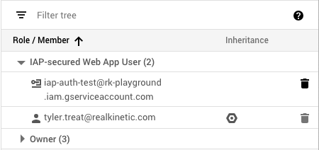 As you can see, both the service account and my user account are IAP-secured Web App Users. This means I can access the application using my Google login or using the service account credentials. Next, we’ll look at how to properly authenticate using the service account.