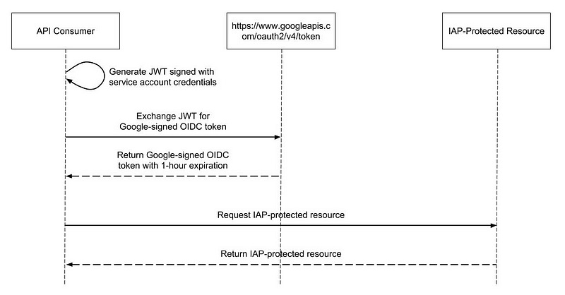 Below is a sequence diagram showing the process of making an OIDC-authenticated request to an IAP-protected resource.