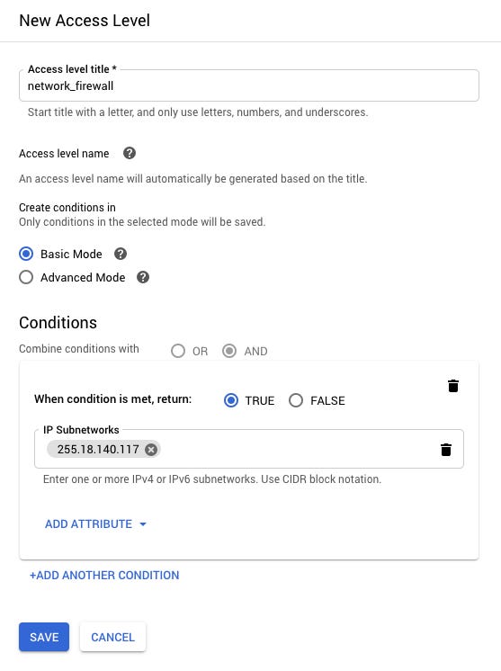 To set up a network firewall in IAP, we first need to create an Access Level in the Access Context Manager. Access Levels are a way to add an extra level of security based on request attributes such as IP address, region, time of day, or device. In the client’s case, they can create an Access Level to only allow access from their corporate network.